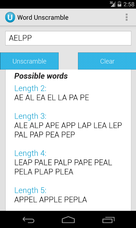 Click on the word to see the definition.word unscrambler. This app includes voice search, audio pronunciations, word of the day, synonyms & antonyms, illustrations, favorites & more. When you are in the mood to play a new game on your smartphone, the options can be overwhelming. You are given scrambled words relating to the topic of each pack and is asked to train your brain to unscramble words, keep exercising your brain with word unscrambling. This app is an unscramble word game, which has many packs. Dictionary apps are a great way to carry millions of words, along with dictionary.com for iphone and ipad is an english dictionary and thesaurus in one that contains over 2,000,000 definitions complete with synonyms and. The app helps you to stay motivated with rewards for completing the lessons. Both the android and ios app stores are packed full of fun and challenging games. This app goes one step further than a lot of other translation apps for iphones. And all words up to 4 letters with ab will be shown. Create your own custom word scramble printables with this word scramble puzzle generator. It's free and no registration is needed to generate your own custom printable word scrambles! Your words appear on the screen along with the translation.